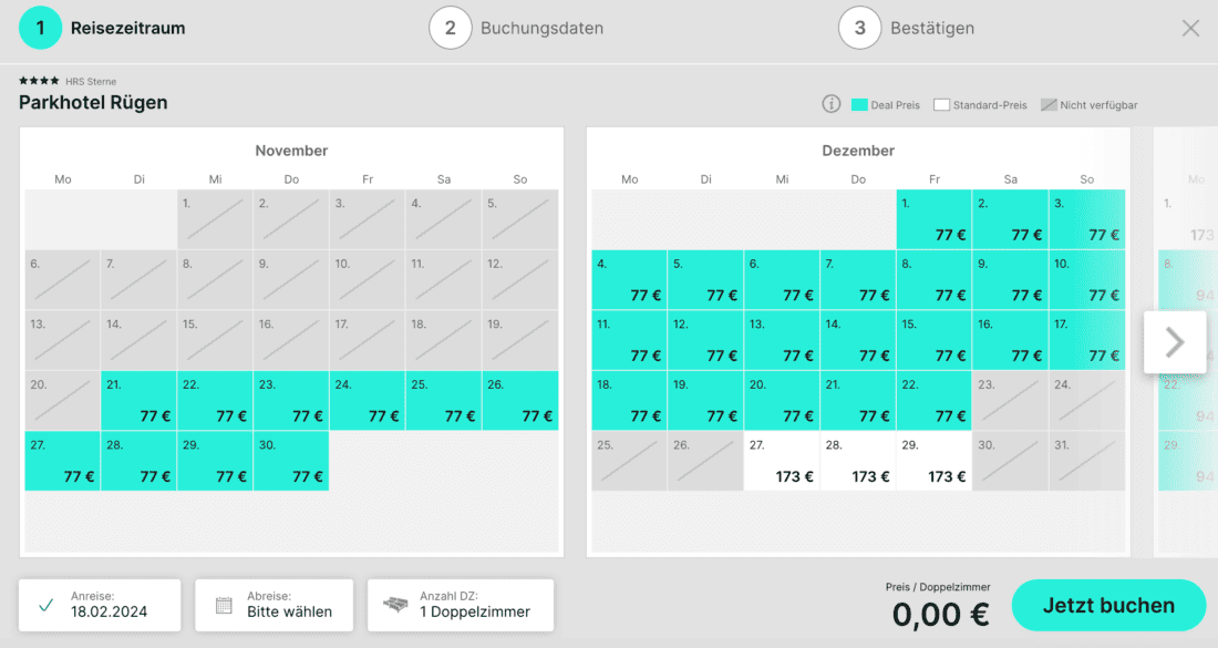Aktuell (Stand 21. November 2023) ist die Angebotsrate an jedem Tag bis zum 22. Dezember 2023 verfügbar, auch übers Wochenende. Das Angebot ist bis zum 27. November 2023 buchbar. Für Übernachtungen im Januar und Februar 2024 zahlt ihr knapp 94€ pro Nacht. Die günstigsten Termine seht ihr im Kalender bei HRS grün markiert: