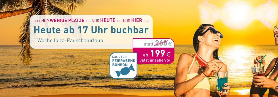 Über LTUR gibt es heute als Feierabend-Bonbon eine Pauschalreise im Mai für eine Woche nach Ibiza für 199€. Inklusive ist der Zug-zum-Flug, Flug mit TUIfly von Frankfurt, Stuttgart oder Hannover, 7 Tage im Mittelklasse-Hotel.