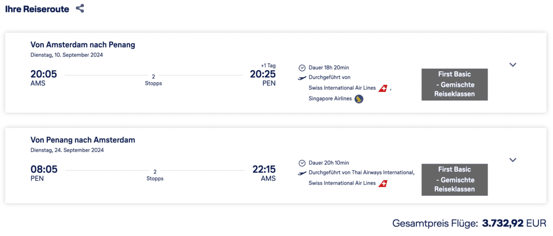 Zunächst geht es in der europäischen Business Class von Swiss bzw. Lufthansa von Amsterdam nach Zürich oder Frankfurt. Die Langstrecke nach Singapur erfolgt dann mit Swiss in einer Boeing 777 bzw. mit Lufthansa in eine Boeing 747. Zwischen Singapur und Penang gibt es dann je nach Datum Flüge mit Scoot / Jetstar (Eco), Thai (Premium Eco) oder Singapore Airlines (Business Class). Hier das Routing mit Swiss: