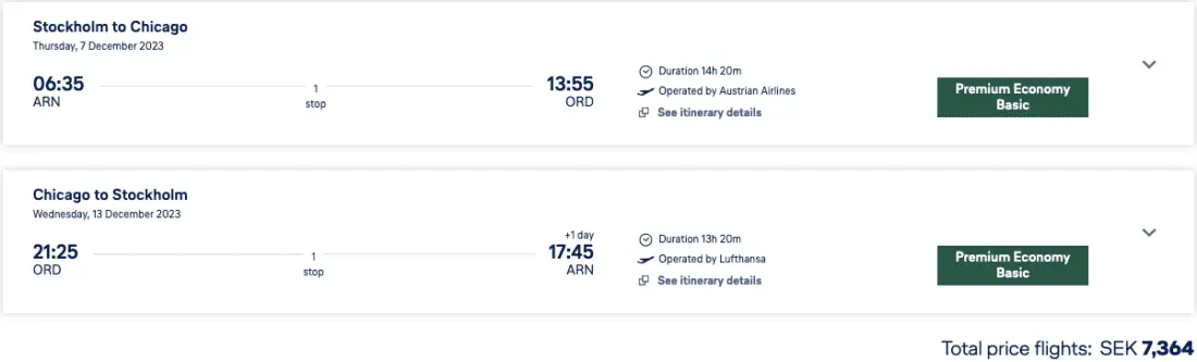Wir geben euch je ein Beispiel für jede Allianz. Zuerst eine Lufthansa-Reise von Stockholm nach Chicago über München: