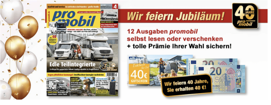 Die Zeitschrift gibt es bis zum 9. Mai für 55,80€ im Abo für 12 Ausgaben. Bei der Bestellung über diesen Link bekommt ihr zusätzlich einen 40€ Gutschein für Fritz Berger (Camping-Shop) oder 40€ als Verrechnungsscheck. Damit könnt ihr die 12 Ausgaben für effektiv 15,80€ bekommen. Nach dem Probezeitraum zahlt ihr weiter 4,65€ pro Ausgabe.