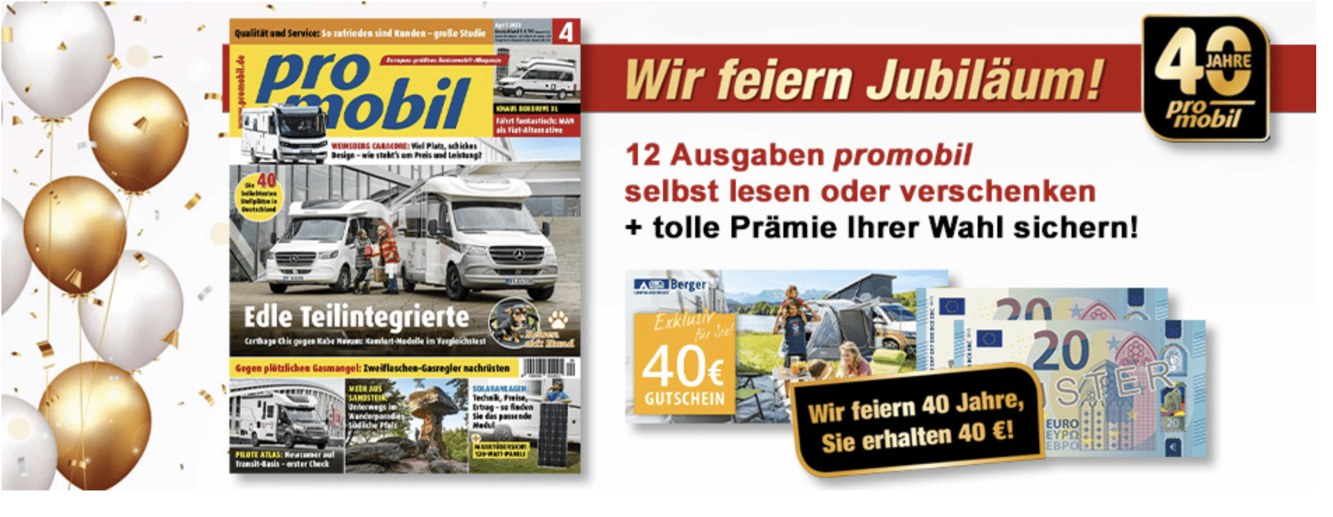 Wenn ihr euch für Camping mit Wohnmobilen interessiert, seid ihr bei promobil genau richtig. Das Magazin ist das größte Reisemobilmagazin Europas und bietet Fahrzeug-Tests und Neuvorstellungen, Reise-Reportagen, Praxis-Tipps und Stellplatz-Informationen. Es ist damit ein hilfreicher Begleiter im Camping-Alltag und ein hilfreicher Kaufberater, wenn ihr neu ins Camping einsteigen wollt, oder nach Verbesserungen für eure Ausrüstung sucht.