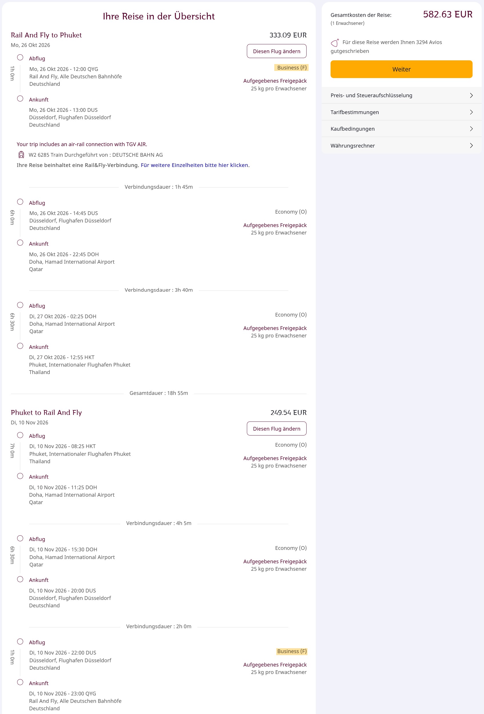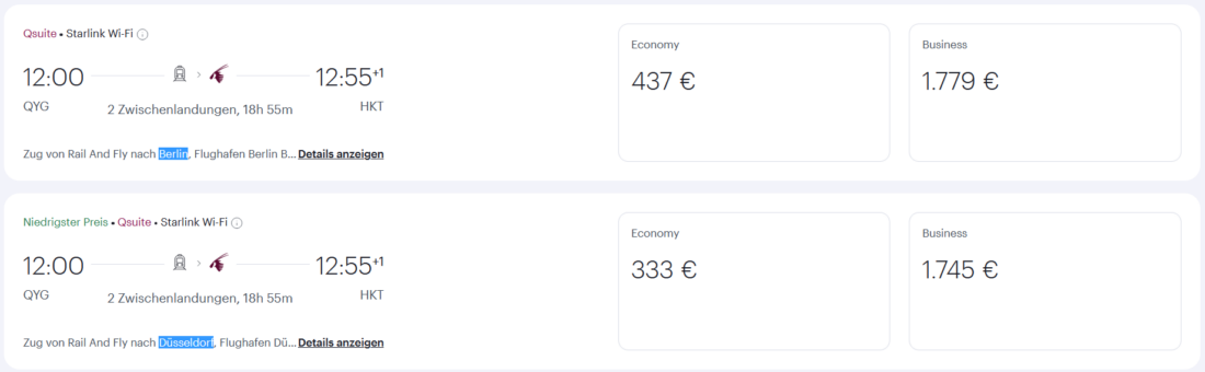 Um die Flüge inklusive Rail&Fly-Ticket zu buchen, müsst ihr auf der Qatar-Website nach dem Abflughafen „Rail and Fly Deutschland QYG“ suchen. Sieht dann etwa so aus:
