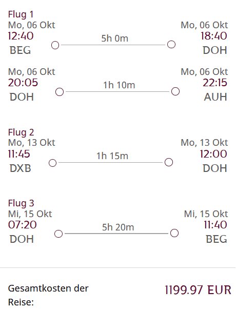 Auch Gabelflüge sind möglich, z.B. Belgrad – Abu Dhabi | Dubai – Belgrad für 1.198€. Wer mag, kann zudem einen mehrtägigen Stopover in Doha einlegen.