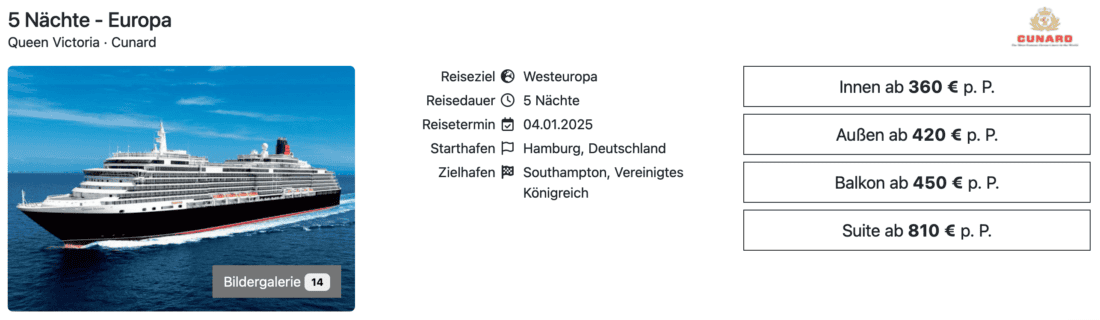 Die Queen Victoria der Reederei Cunard wird Anfang Januar 2025 auf einer Kreuzfahrt von Hamburg nach Southampton eingesetzt. Dies ist eine hervorragende Möglichkeit, das Schiff einmal zum günstigen Preis kennenzulernen oder auch allgemein in die spannende Welt der Kreuzfahrten hineinzuschnuppern. Für die 5 Nächte zahlt ihr in einer Innenkabine der Kategorien IF oder ID momentan nur 360€ pro Person.