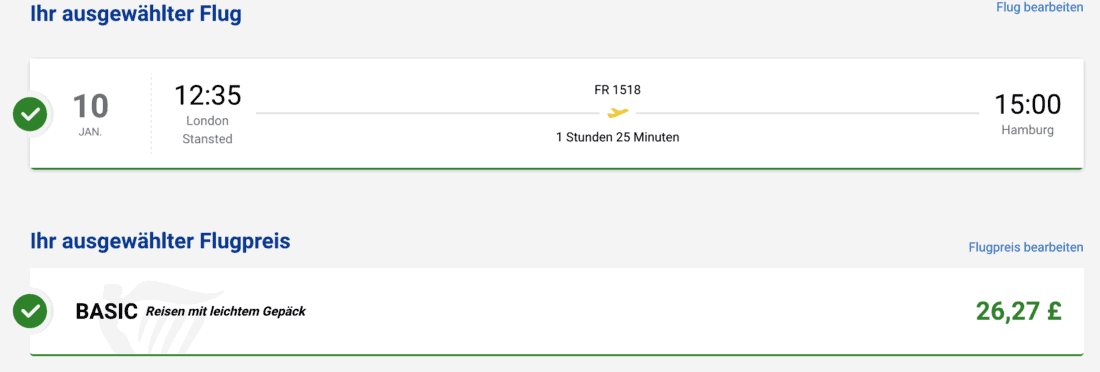 Nach Ankunft in Southampton ist es preislich am günstigsten, wenn ihr von London zurückfliegt. Hier habt ihr dann zahlreiche Möglichkeiten. Ein Beispiel ist der Flug mit Ryanair am 10. Januar 2025 von London-Stansted nach Hamburg, welcher aktuell ab 27 £ (~31 €) (zzgl. 28 £ (~32 €) für 20 kg Aufgabegepäck) buchbar ist:
