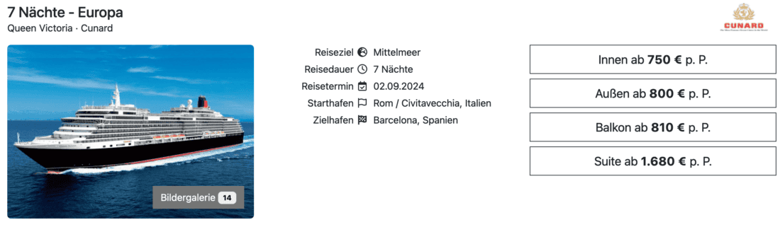 Die Queen Victoria der Traditionsreederei Cunard ist diesen Sommer auf verschiedenen Routen im Mittelmeer unterwegs. Anfang September 2024 könnt ihr aktuell besonders günstig auf Reisen gehen. Besonders hervorzuheben ist dabei die Balkonkabine, welche ab 870€ pro Person (Kategorie BF) buchbar ist. Die Außenkabinen (ab 800€) und Innenkabinen (ab 750€) sind dabei nur geringfügig günstiger. Alle genannten Preise gelten pro Person bei einer Doppelbelegung.