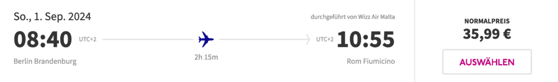 Die Kreuzfahrt startet in Civitavecchia (ca. 70 Kilometer vom internationalen Flughafen Rom-Fiumicino entfernt) und endet in Barcelona. Deshalb benötigt ihr für die An- und Abreise zwei Oneway-Flüge. Einen günstigen Flug nach Rom gibt es beispielsweise am 1. September 2024 mit Wizzair von Berlin. Diese Verbindung ist aktuell ab 36€ (+44€ inkl. 20 kg Aufgabegepäck) verfügbar: