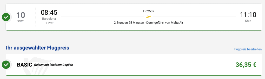Nach der Ankunft in Barcelona habt ihr zahlreiche Möglichkeiten für euren Rückflug. Eine Option ist dabei die Verbindung mit Ryanair am 10. September 2024 nach Köln. Dieser Flug ist ab 37€ (+44€ für 20 kg Aufgabegepäck) buchbar: