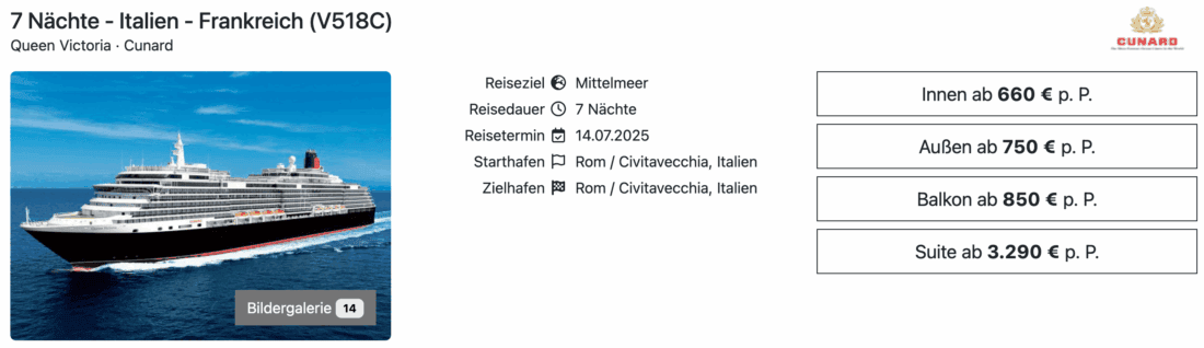 Mit der Queen Victoria der britischen Reederei Cunard könnt ihr am 14. Juli 2025 während der Hochsaison günstig im Mittelmeer in See stechen. Somit habt ihr die Chance, während der Sommerferien eine preiswerte Kreuzfahrt zu buchen und tolle Ziele im besten Reisezeitraum zu erkunden.