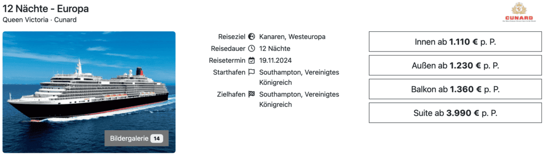 Die Queen Victoria der Traditionsreederei Cunard ist im November 2024 auf einer Reise in Richtung Portugal und kanarische Inseln im Einsatz. Für 12 Nächte an Bord zahlt ihr in einer Innenkabine aktuell 1.110€ pro Person. Deutlich attraktiver dürfte da im Vergleich eine Außenkabine für 1.230€ sein. Wer zusätzlich auf seinem eigenen Balkon entspannen möchte, der kann eine entsprechende Kabine ab 1.360€ buchen (jeweils pro Person bei Doppelbelegung). Start und Ziel der Reise ist in Southampton.