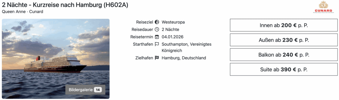 Bei der Queen Anne handelt es sich um das neueste Flottenmitglied der Traditionsreederei Cunard. Wer Lust darauf hat, das neue Schiff einmal kennenzulernen, der kann aktuell eine 3-tägige Schnupperkreuzfahrt von Southampton nach Hamburg mit Abreise am 4. Januar 2026 ab 210€ pro Person in einer Innenkabine buchen. Interessanter sind da im Vergleich schon die Außen- und Balkonkabinen ab 230€ bzw. 240€ (jeweils pro Person). Alleinreisende zahlen mindestens 322€.