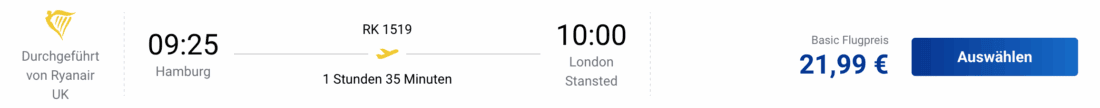 Nach London gibt es zahlreiche Möglichkeiten für den Hinflug. Eine günstige Variante ist etwa der Direktflug mit Ryanair am 7. Oktober 2025 von Hamburg nach London-Stansted, welchen ihr aktuell ab 22€ (zzgl. 27€ für 20 kg Aufgabegepäck) buchen könnt: