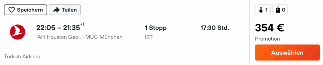 Nach Ankunft in Galveston gibt es verschiedene Optionen für den Rückflug, etwa mit Turkish Airlines nach München bereits ab 354€ (inkl. Aufgabegepäck):