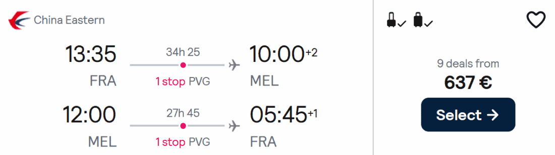 So gute Preise nach Australien gab es länger nicht mehr. China Eastern fliegt euch ab 637€ nach Melbourne, Sydney oder Brisbane. Und zwar direkt vom Flughafen Frankfurt und inklusive 2x 23 kg Freigepäck. Es gibt (mindestens einen) 13-Stunden-Layover in Shanghai, aber so kann man sich zumindest zwischen zwei langen Flügen die Beine vetreten.