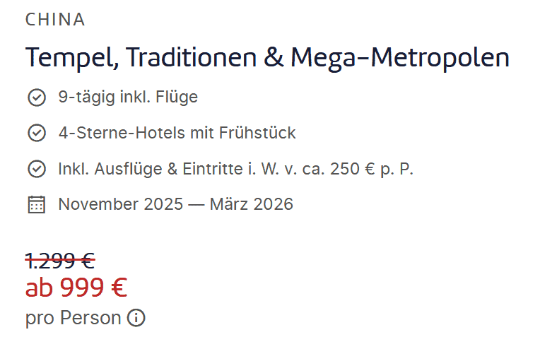 Bei Berge&Meer ist eine 7-tägige Tour durch China für 999€ pro Person buchbar (bei Reise zu zweit). Die Route klingt nicht unattraktiv. Sie startet in Zhengzhou im Landesinneren, dann geht es per Zug nach Peking und Shanghai. Enthalten sind Flüge, Rail&Fly, Busfahrt und die Zugfahrten. Geführt sind aber nur die ersten zwei Tage der Tour, danach seid ihr auf euch alleine gestellt – oder müsst das „Ausflugspaket“ für 220€ buchen.