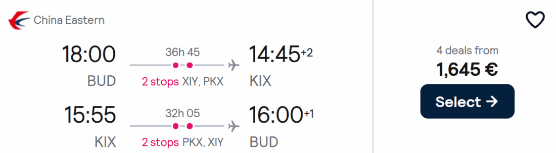 In der Business Class von China Eastern geht es für rund 1.700€ von Budapest nach Japan. Mögliche Ziele sind zum Beispiel Osaka, Nagoya oder Hiroshima. Ihr müsst allerdings in beiden Richtungen zweimal innerhalb Chinas umsteigen, und dadurch dann auch nach China einreisen.