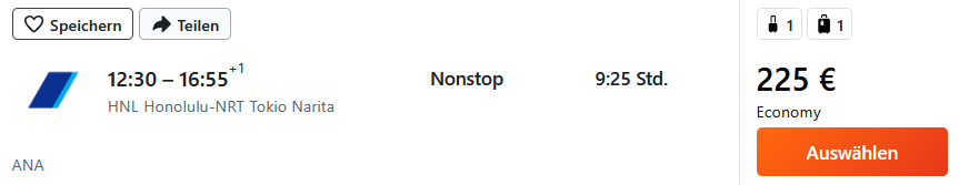 Wieso der Deal nicht auf der Seite war: Laut Preisverlauf von Google Flights gab es den Nonstop-Flug kürzlich noch für 210€ statt 235€ (Airline-Preis). Und einen Tag lang sogar noch etwas günstiger. Sollte der Preis wieder fallen, präsentieren wir ihn gerne als „richtigen“ Deal. Auch die aktuellen 225€ sind zweifelsohne ein guter Deal, aber eben nicht mehr ganz so gut.