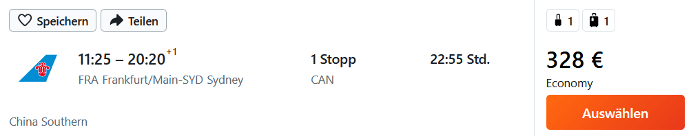 Ihr wollt das deutsche Regenwetter verlassen und so weit weg wie möglich? Dann hat China Southern das perfekte Angebot für euch. Ab nur 325€ könnt ihr Ende November oder Anfang Dezember von Frankfurt nach Australien fliegen. 23 kg Freigepäck sind inkludiert.
