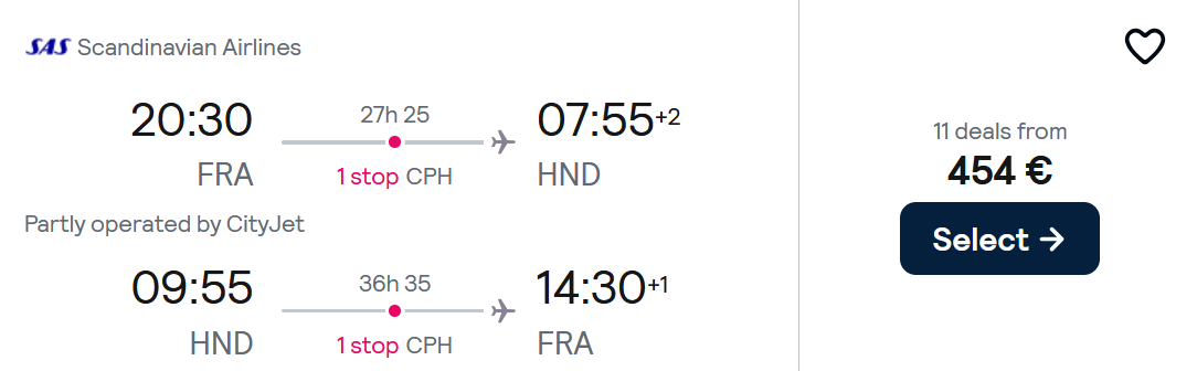 Wir haben euch diese Woche Tickets von Frankfurt nach Bangkok ab 406€ mit SAS vorgestellt. Ein ähnliches Angebot gibt es auch nach Tokio mit Preisen ab 454€. Auf dem Hinweg müsst ihr aber mindestens 13h in Kopenhagen bleiben (über Nacht), auf dem Rückweg gibt es einen 21-stündigen Layover dort.