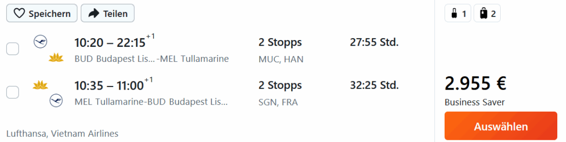 In der Business Class vom SkyTeam-Mitglied Vietnam Airlines könnt ihr ab 2.955€ von Ungarn nach Australien fliegen. Es geht zunächst mit der Lufthansa nach München oder Frankfurt, und dann mit Vietnam Airlines über Hanoi oder Ho-Chi-Minh-Stadt weiter nach Australien. Teils, aber nicht immer, gibt es dort einen längeren Zwischenstopp.