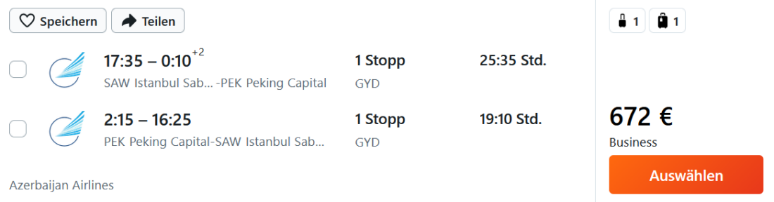 Im November haben wir euch schon einmal extrem günstige Business-Class-Tickets von Europa nach Peking mit AZAL Azerbaijan Airlines präsentiert. Jetzt sind sie zurückgekehrt, sogar noch etwas günstiger. Ab 672€ könnt ihr von Istanbul starten, ab 895€ und von Berlin für 200€ mehr. Auf dem Hinweg ist immer eine Nacht in Baku erforderlich, nach Berlin gibt es auf dem Rückweg einen 2. 24h-Aufenthalt.