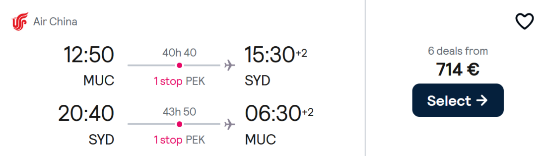 Ähnlicher Preis, auch nach Peking… aber dann noch weiter nach Australien bringt euch ein anderer Deal von Air China. Leider nur in der Economy Class, dafür direkt ab München. Man kann eben nicht alles haben. Immerhin bleibt bei 2x 21h Layover in Peking auch genug Zeit, um die chinesische Hauptstadt zu erkunden.