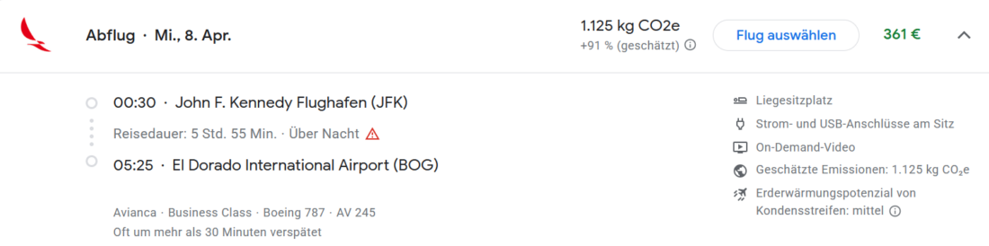Wieso der Deal nicht auf der Seite war: Wer von Europa nach Bogota fliegt, dürfte eher nicht den Umweg über die USA wählen. Als Weltreisebaustein schon attraktiver, mit einem Preis von 60€ pro Stunde Lie-Flat-Sitz. Aber nur, wenn es den auch wirklich gibt. Bei all den verschiedenen Konfigurationen, die auf der Strecke unterwegs sind, scheint ein Flugzeugwechsel recht wahrscheinlich. Und der Deal zur Wundertüte.