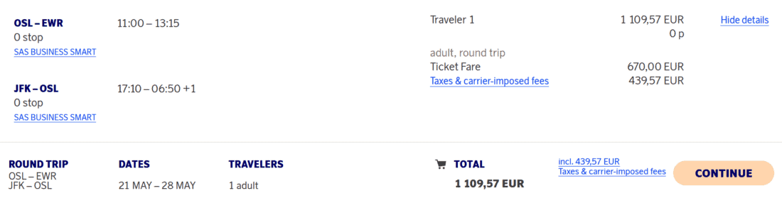 - Business Class: Oslo – New York nonstop für 1.110€ statt 1.559€ (-29%)
