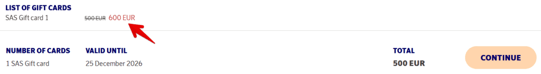 Aktuell bietet die Airline ordentliche 20% Bonus beim Kauf von Geschenkkarten. Ihr könnt bspw. einen Gutschein im Wert von 600€ für nur 500€ erwerben. Das entspricht dann einem Rabatt in Höhe von 16,7%.