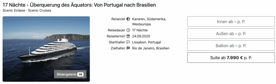 Habt ihr Lust auf eine Atlantiküberquerung, die auf einem kleinen Luxusschiff stattfindet und mit zahlreichen Inklusivleistungen punktet? Dann haben wir genau das richtige Angebot für euch. Die Scenic Eclipse der Reederei Scenic Cruises fährt Ende September 2025 von Lissabon nach Rio de Janeiro.