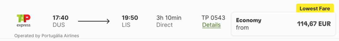 Die Kreuzfahrt startet in Lissabon und endet in Rio de Janeiro. Für die Anreise nach Portugal könnt ihr etwa den Direktflug mit TAP am 23. September von Düsseldorf nutzen, welcher momentan ab 115€ (zzgl. 36€ für Aufgabegepäck) buchbar ist: