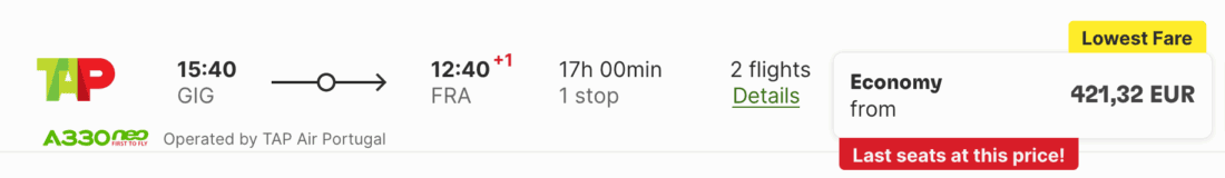 Nach Ende der Kreuzfahrt gibt es zahlreiche Optionen für euren Rückflug. Ein Beispiel ist die Verbindung mit TAP am 12. Oktober 2025 nach Frankfurt, die ihr euch ab 422€ (zzgl. 56€ für Aufgabegepäck) sichern könnt: