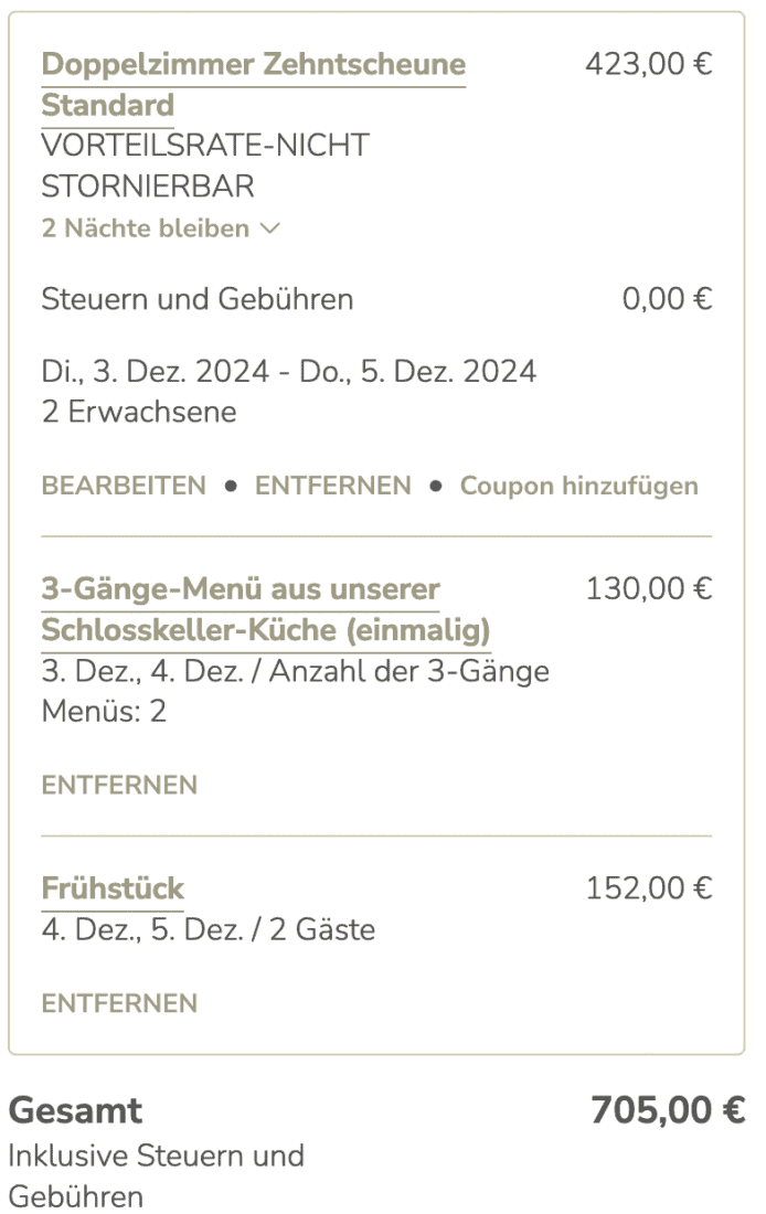 Bei Buchung über Secret Escapes zahlt ihr für 2 Übernachtungen im Doppelzimmer in der Zehntscheune an den Beispieldaten vom 3. bis 5. Dezember 2024 insgesamt 398€. Darin sind, wie eingangs erwähnt, das Frühstück sowie ein 3-Gänge-Dinner am ersten Abend enthalten: