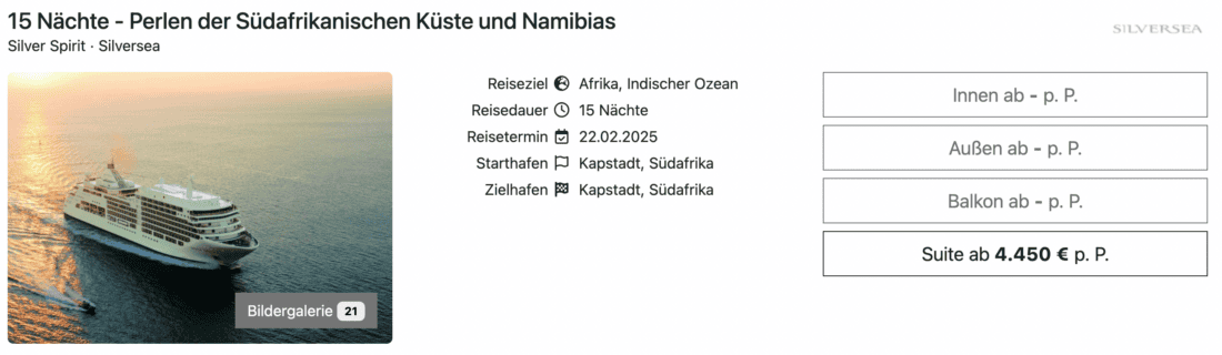 Die Silver Spirit der US-Luxusreederei Silversea Cruises wird im Februar 2025 ab/bis Kapstadt eingesetzt. Dabei besucht ihr zahlreiche Städte in Südafrika und es gibt auch einen Abstecher nach Namibia. Für die 15 Nächte an Bord zahlt ihr in der günstigsten Suite bei Wahl des Tarifs Essential momentan 4.450€ pro Person. Gegen Aufpreis stehen aber selbstverständlich viele weitere Kategorien zur Verfügung, etwa die Panorama Suite ab 5.350€ pro Person.