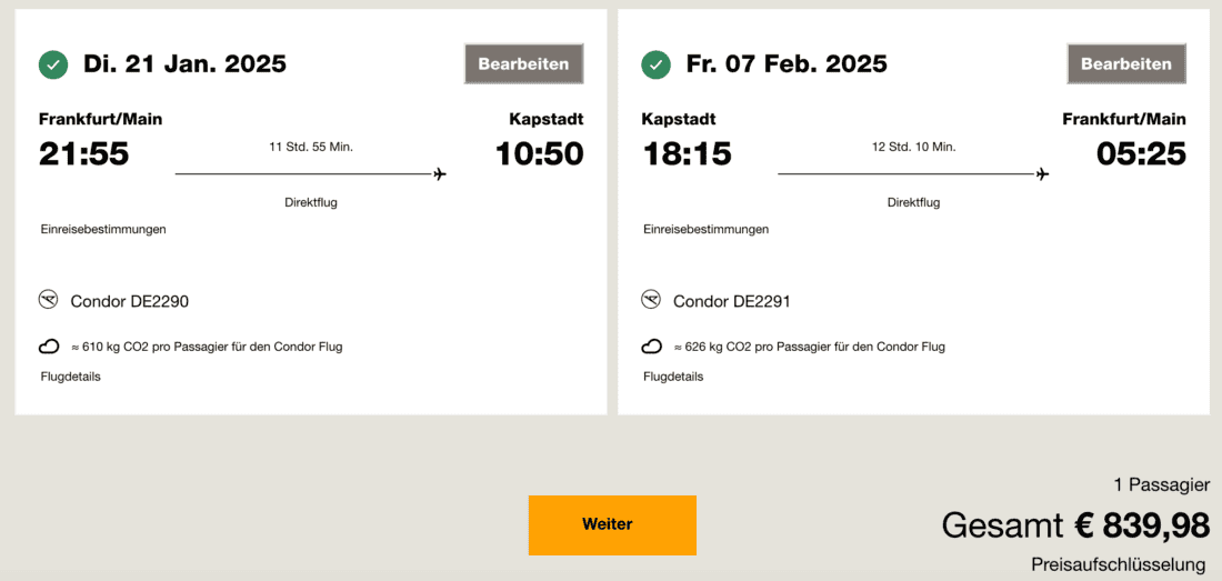 Die Kreuzfahrt startet und endet in Kapstadt. Eine Variante für die An- und Abreise von Deutschland sind die Direktflüge ab/bis Frankfurt mit Condor. Diese könnt ihr momentan ab 840€ (inkl. Aufgabegepäck) buchen: