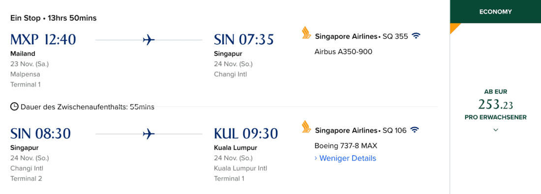 Aktuell verkauft Singapore Airlines günstige Oneway-Tickets von Mailand nach Kuala Lumpur. Diese Flüge erfolgen mit einem kurzen Zwischenstopp über Singapur. Tickets könnt ihr bereits ab 254€ buchen und Verfügbarkeiten gibt es an ausgewählten Daten im November 2024. Der günstigste Tarif Economy Lite beinhaltet bereits 25 kg Freigepäck.