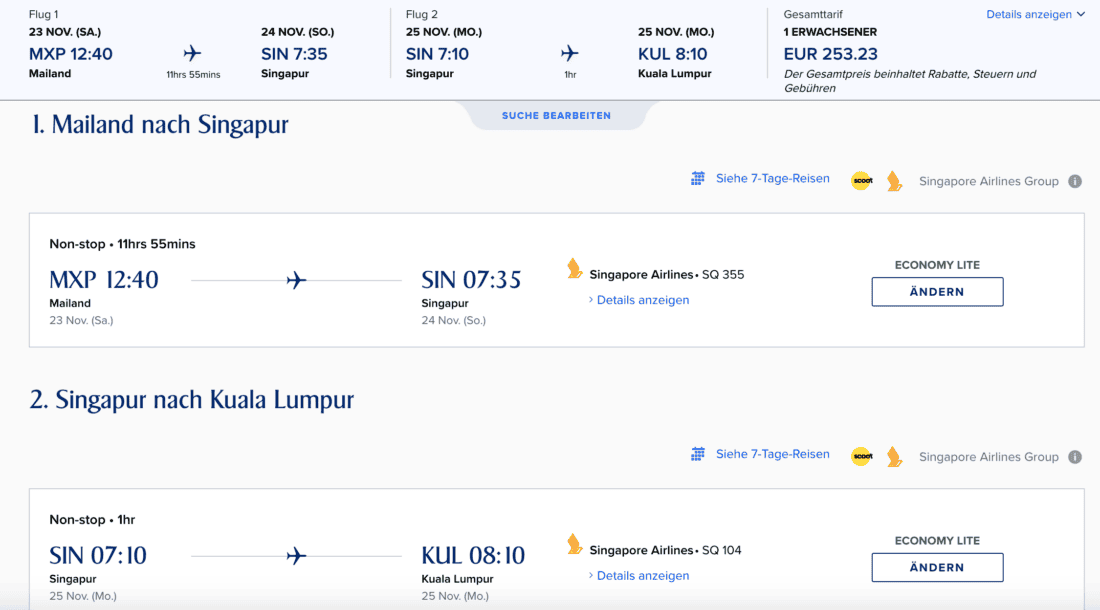 Passende Termine findet ihr schnell & einfach mithilfe von Google Flights (Anleitung). Buchen könnt ihr anschließend entweder direkt über Singapore Airlines (ab 254€) oder ihr nutzt einen der Anbieter in der Kayak-Flugsuche (ab 243€).