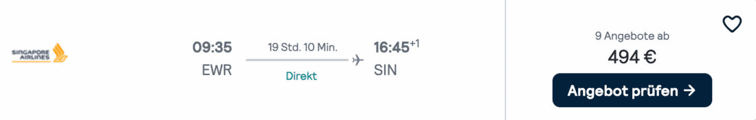 Die Gegenrichtung (d.h. von Singapur nach New York) ist mit Preisen ab 564€ ähnlich günstig.