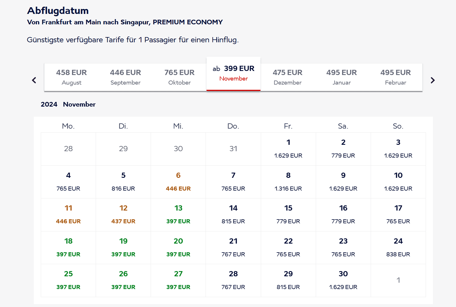 Aktuell verkaufen die SkyTeam-Allianz Air France und KLM günstige Flüge von Deutschland nach Singapur. Tickets für einen Hin- und Rückflug in der Premium Economy Class gibt es momentan schon ab 799€ und Verfügbarkeiten lassen sich für Reisen von November und Dezember 2024 finden.