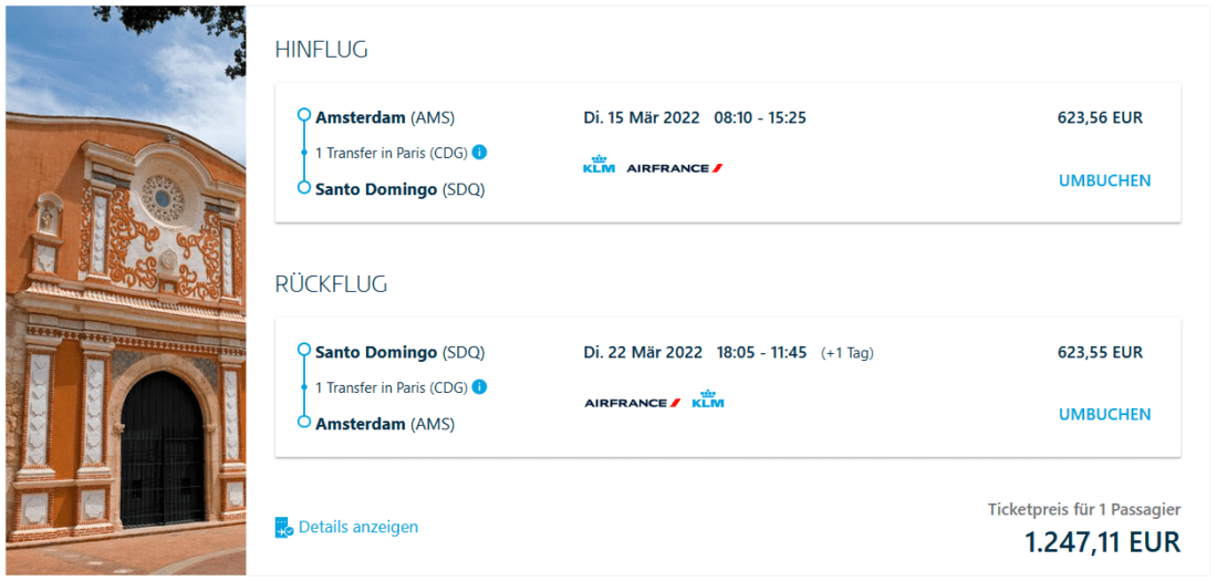 Die SkyTeam-Airlines KLM, Air France & COPA bieten derzeit Tickets für Business-Class-Flüge in die Dominikanische Republik vergünstigt an. Mit Abflug von Amsterdam kann man bei Verfügbarkeiten von März bis Oktober ab 1.247€ nach Santo Domingo reisen. Ihr fliegt wahlweise über Paris mit Air France oder über Panama City mit KLM und COPA.