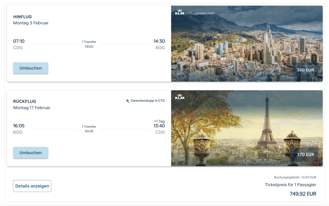 Die Tickets werden in Buchungsklasse Y (Economy Class) bzw. A (Premium Economy Class) ausgestellt. Für den oben verlinkten Beispielflug von Paris nach Bogota könnt ihr somit voraussichtlich mit den folgenden Meilengutschriften rechnen, sofern die Buchung durchgängig auf KLM-Flugnummern erfolgt: