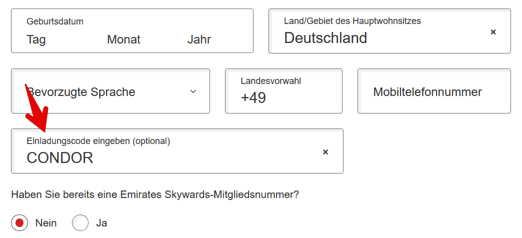 Den Einladungscode müsst ihr bei der Registrierung zu Skywards am Ende des Formulars eingeben: