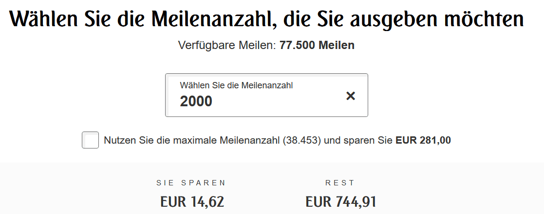 Leider hat Emirates den Wert der Skywards-Meilen zuletzt mehrfach dezimiert, u.a. durch die Erhöhung der Treibstoffzuschläge auf absurde Höhen. Wer eine Flugbuchung geplant hat, kann 2.000 Meilen zumindest per Cash&Miles einlösen und dann knapp 15€ Rabatt auf den Ticketpreis erhalten: