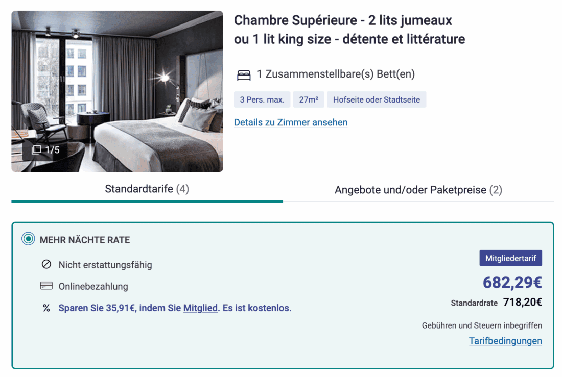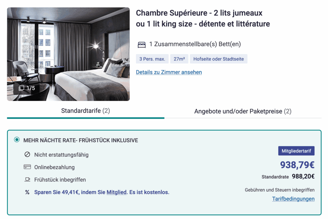 Bei einer Direktbuchung über die Webseite des Hotels werden im gleichen Zeitraum für ein Superior-Zimmer inklusive Frühstück 938,79€ fällig. Dieser Tarif beinhaltet eine Ermäßigung in Höhe von 5% für ALL-Mitglieder: