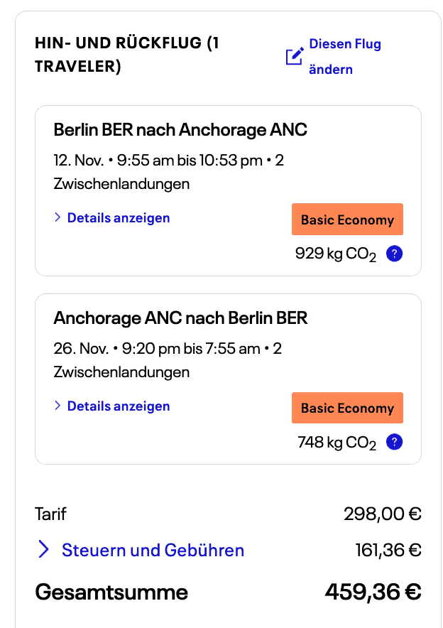 Wie die Verbindungen im Einzelnen aussehen, hängt dabei im Wesentlichen davon ab, wo ihr startet. Im oben verlinkten Beispiel fliegt ihr mit United Airlines über New York und Denver nach Anchorage. Der Rückflug geht dann über Chicago und New York wieder in die deutsche Hauptstadt.