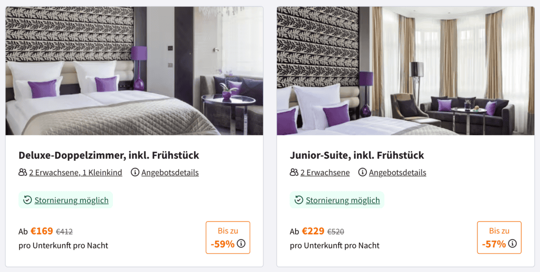 Für eine Übernachtung im Deluxe-Doppelzimmer im Zeitraum vom 12. auf den 13. Januar 2025 zahlt ihr bei Buchung über Secret Escapes momentan 169€ sowie 5% Touristiksteuer. Dadurch ergibt sich ein Gesamtpreis in Höhe von 177,45€: