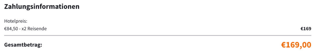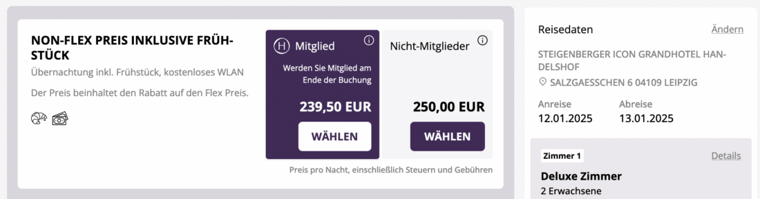 Bei Buchung über die offizielle Webseite des Hotels werden im gleichen Zeitraum und für die identische Zimmerkategorie 239,50€ sowie ebenfalls 5% Touristiksteuer fällig, was sich dann auf insgesamt 251,48€ summiert. Dieser Preis gilt für Mitglieder im Treueprogramm H Rewards. Diese Rate erlaubt jedoch keine Umbuchung oder Stornierung: