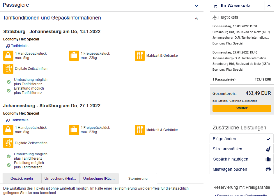 Auf der Strecke von Straßburg nach Johannesburg hat die Lufthansa derzeit einen günstigen Flex-Tarif geladen. Ihr könnt den Hin- und Rückflug in Economy Flex für 433€ buchen. Der Flex-Tarif beinhaltet nicht nur 23 kg Aufgabepäck, sondern ist auch jederzeit vor Abflug kostenlos stornierbar. Ihr erhaltet dann eine vollständige Erstattung auf das genutzte Zahlungsmittel.