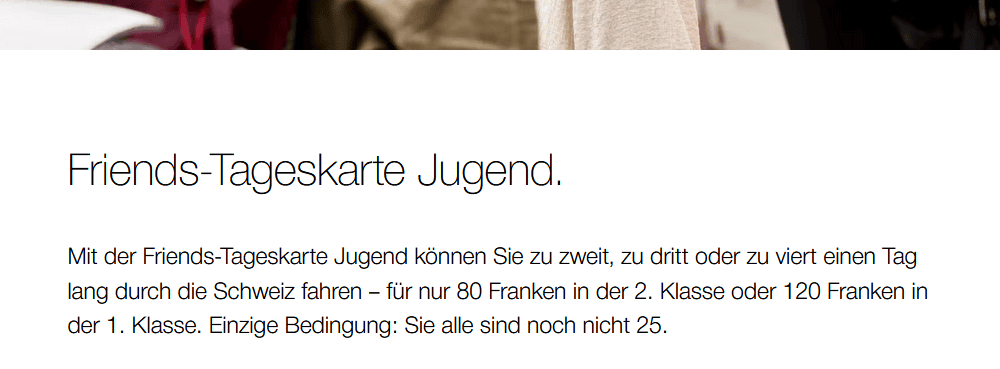 Die Rede ist von der Friends-Tageskarte Jugend. Mit dieser können bis zu 4 Personen einen Tag lang quer durch die Schweiz fahren. Die Karte gilt von Mitternacht bis 5 Uhr des Folgetages im gesamten GA-Geltungsbereich. Darunter sind neben den Schweizer Bahnunternehmen auch Busse, Trams, Schiffe sowie einige Berg- und Seilbahnen. Mehr dazu weiter unten.
